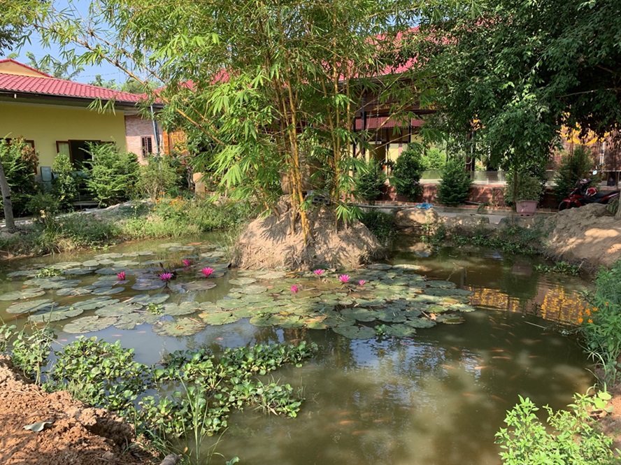 Following this centerpiece was a smaller rock formation nestled within a circular pond. Behind it stood the Salvaged Stupa, housing the remains of sentient beings. In the foreground, two patches of verdant grass framed a venerable tamarind tree, its age apparent in its gnarled branches.