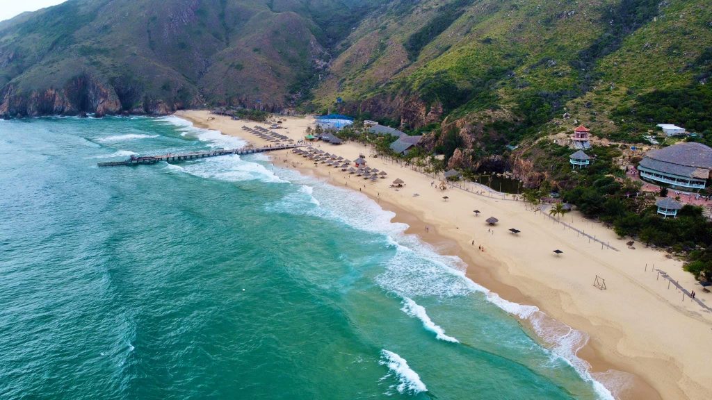 Located roughly 25 kilometers northeast of Quy Nhon’s city center in Binh Dinh Province, Ky Co Beach is part of Nhon Ly Commune. This gem of Binh Dinh travel boasts a unique combination of rugged mountains, stretches of pristine white sand, and emerald seawater. Shaped like a crescent, the beach is embraced by mountains on three sides, with its remaining side facing the sea, making it resemble a secluded island paradise.