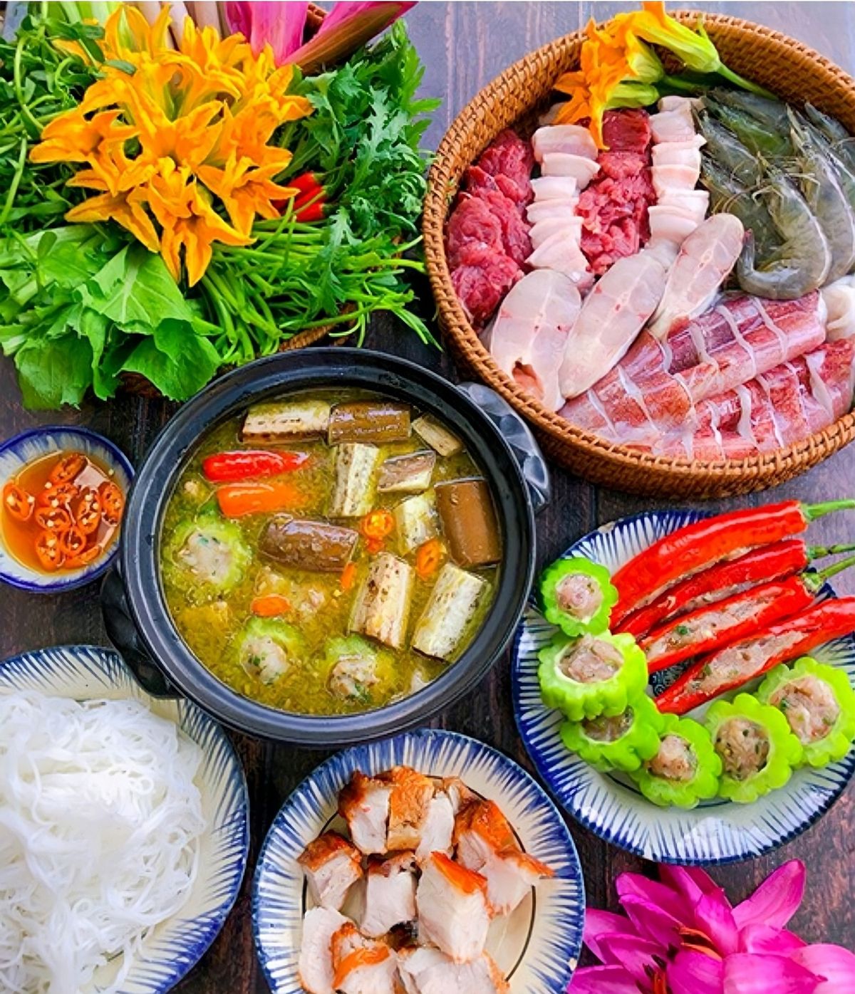 Lau mam, a traditional Vietnamese hot pot hailing from Chau Doc, is a culinary gem on the map of South Vietnam. The broth, made from fermented pastes like mam sac, mam linh, and mam tren, is a symphony of sweet and salty flavors. Mam sac is the highlight, made by fermenting snakeskin gourami fish with various ingredients. The broth is then enriched with an abundance of the Mekong Delta’s treasures – fish, squid, shrimp, eel, anchovies, herbs, flowers, vegetables, etc – offering a taste of the entire region in one bowl.