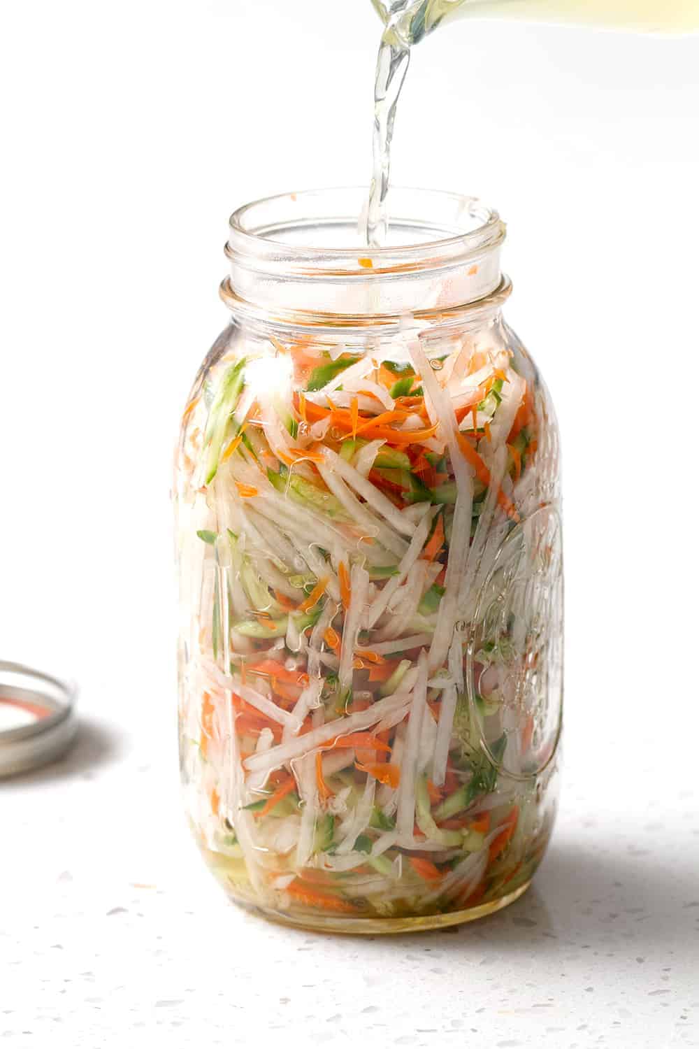 Transfer the vegetables to the clean container and pour the cooled vinegar-sugar mixture over them. After 3 hours, enjoy this pickled delight. For longer storage, use sterilized glass jars and refrigerate for up to a month. Vietnamese pickled vegetables for banh mi offer a delightful sweet-sour balance with a satisfying crunch.