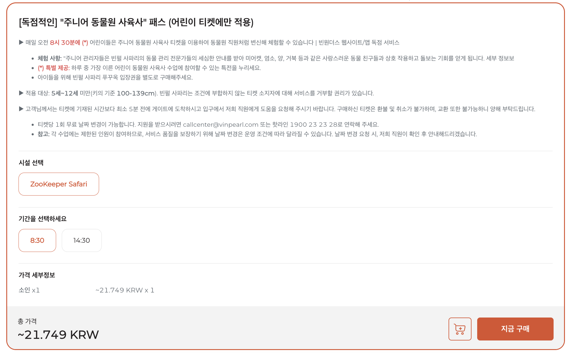귀하의 아이가 이미 빈펄 사파리 푸꾸옥 입장 티켓을 소지하고 계신가요? 걱정하지 마세요. 주니어 동물원 사육사 프로그램에 참여하기 위한 별도의 티켓을 구매하시면 됩니다. 아이당 400.000 VND/부터 (~22.000KRW/부터) !! [초한정수량] 다른 곳에서는 사용할 수 없습니다 !! |