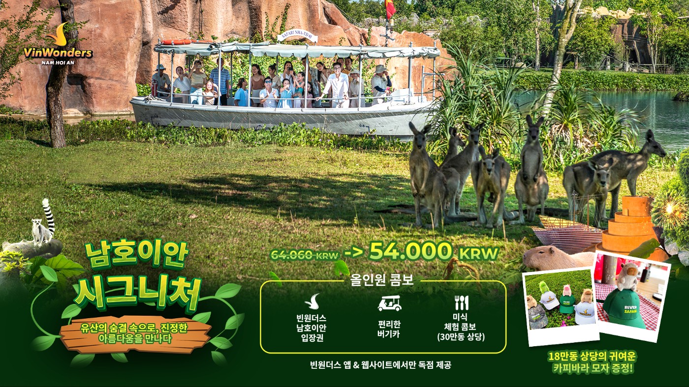빈원더스 남회안은 워터파크, 전통공예마을, 스릴 넘치는 놀이기구, 화려한 쇼 등 다채로운 즐길거리로 끝없는 즐거움을 선사합니다. 특히, 사랑스러운 동물들이 가득한 베트남 최초이자 최대 규모의 준자연형 강가 생태공원 ‘리버 사파리’ 방문을 놓치지 마세요.