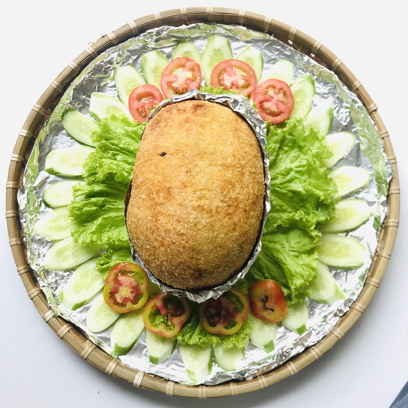 Gà được bao bọc bên trong lớp xôi dẻo, sau đó chiên vàng giòn. Bên ngoài, nó trông như một quả trứng khổng lồ đầy ấn tượng. Thịt gà ở đây chín mềm, đầy nước, không hề khô. Lớp xôi bên ngoài giòn tan, trong mềm dẻo và mang hương thơm đặc trưng của nếp.