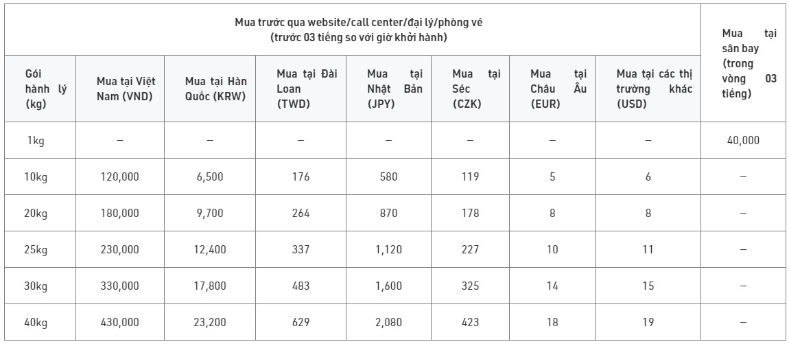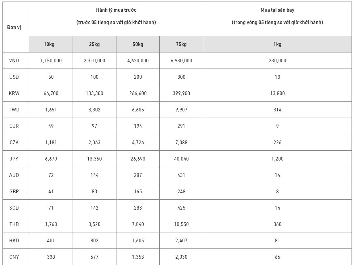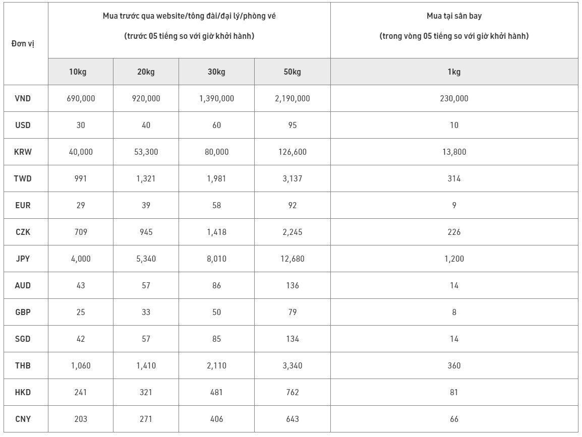 - Hành lý ký gửi quá cân hoặc phát sinh mua tại sân bay được tính 40.000 VNĐ/kg.