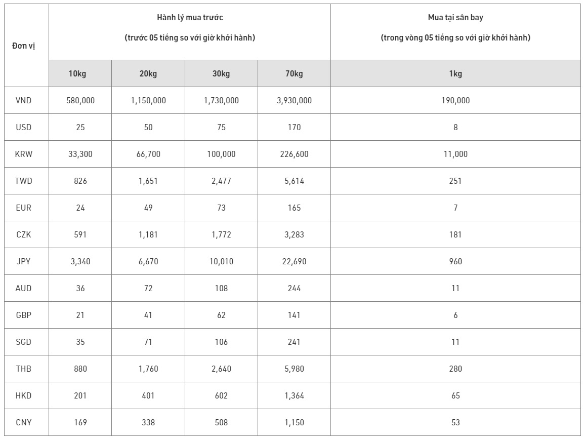 - Giá mua trước hành lý ký gửi chưa bao gồm VAT khi mua tại Việt Nam.