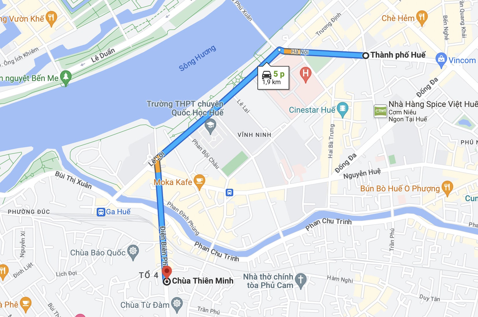 Chùa cách trung tâm thành phố Huế chỉ khoảng 1,7km. Để di chuyển tới đây, bạn khởi hành từ trung tâm thành phố, đi theo đường Hà Nội. Sau khi tới ngã tư giao giữa đường Hà Nội và đường Lê Lợi, du khách rẽ trái vào đường Lê Lợi. Kế đến, bạn tiếp tục đi thẳng rồi rẽ trái vào đường Điện Biên Phủ, đi thêm một đoạn sẽ thấy chùa Thiên Minh Huế nằm bên tay trái.