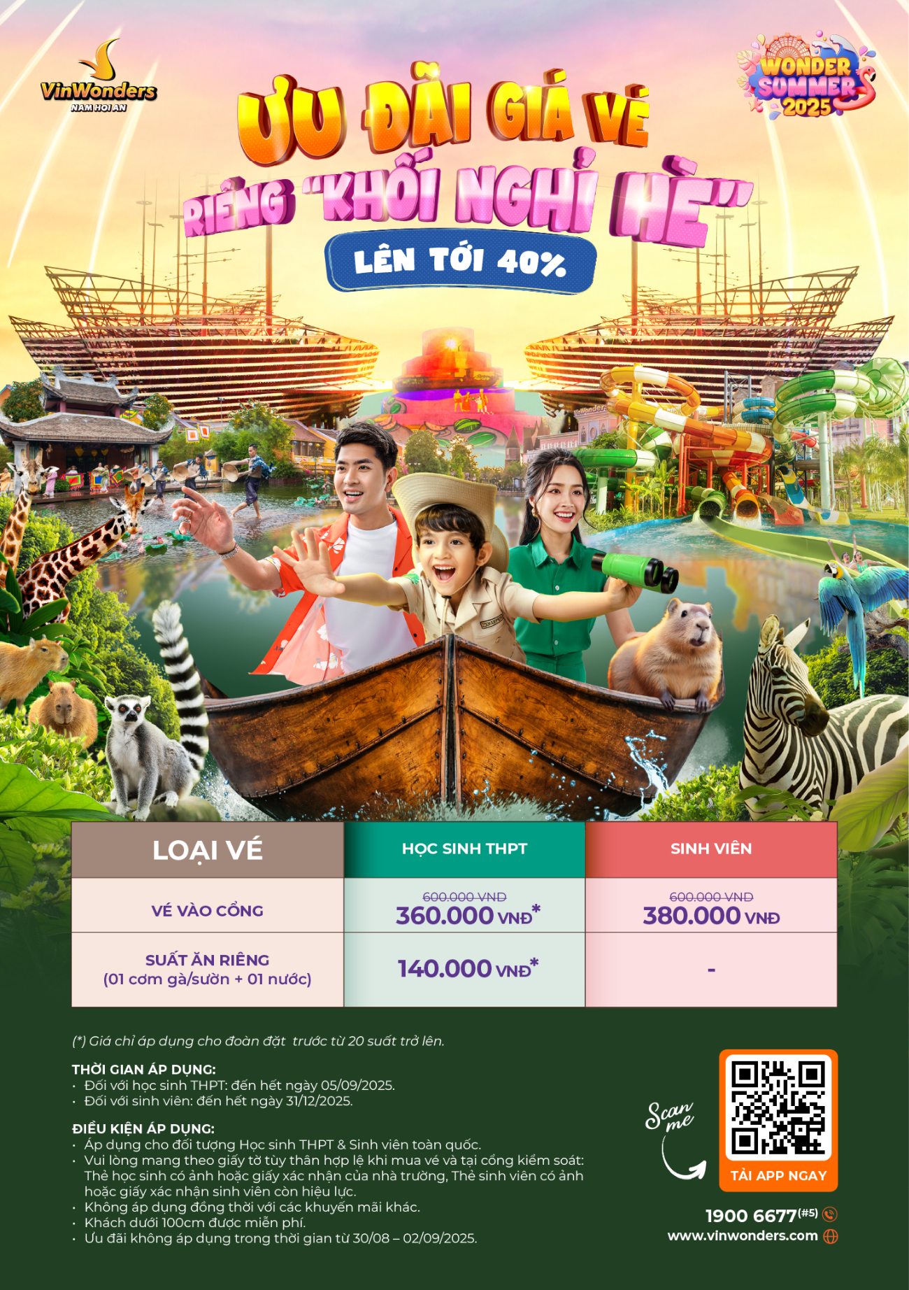 Ưu đãi tới 40% dành riêng cho “Khối Nghỉ Hè” Ưu đãi độc quyền: Chỉ từ Hòa vào không khí sôi động chào hè, VinWonders Nam Hội An mang đến chương trình ưu đãi giá vé lên đến 40% dành riêng cho học sinh THPT và sinh viên trên toàn quốc: